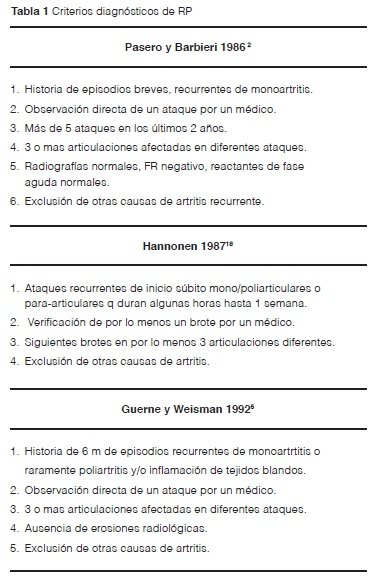 El diagnóstico del RP es básicamente clínico, se han descrito algunos criterios diagnósticos como los de Pasero, Hannonen y Guerne2,5,18 (Tabla 1).