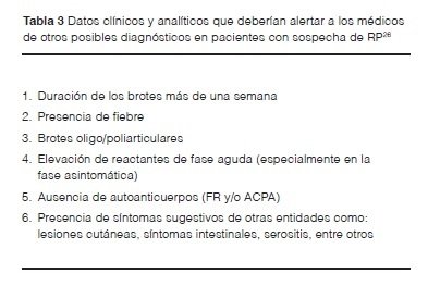 En la tabla 2 se presentan los diferentes cuadros que pueden cursar con artritis intermitentes y obligan a un diagnóstico diferencial con el RP. Y en la tabla 3 se exponen algunos datos presentes en pacientes con sospecha de RP que según nuestro criterio deben alertar al clínico sobre la posibilidad de otros diagnósticos26.