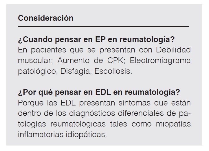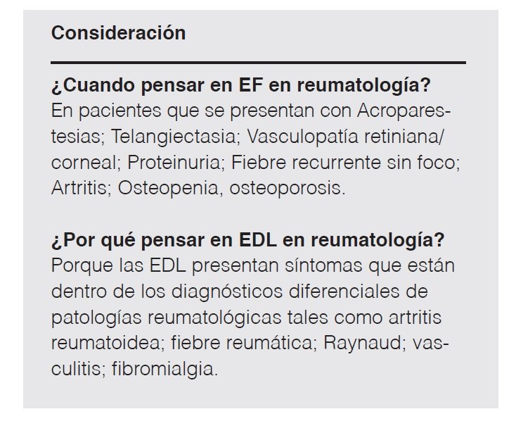 El objetivo de esta revisión esquemática es alertar sobre las presentaciones clínicas de las diferentes EDL que presentan manifestaciones clínicas vinculables con enfermedades reumatológicas para incorporar en la sospecha de diagnóstico diferencial. Nos referiremos a: