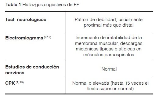 Debilidad muscular proximal de miembros inferiores, músculos paraespinales.