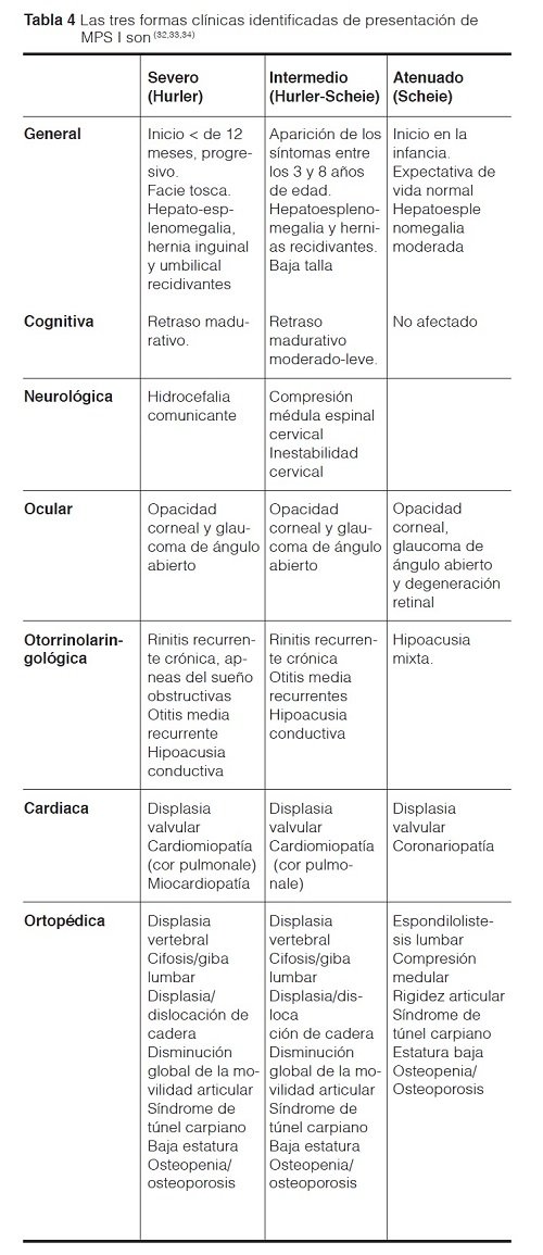 Las formas clínicas de presentación de la MPS I son descritas en la tabla.