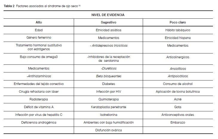 Existen múltiples factores que han sido asociados al SOS, ya sea por una producción inadecuada de lágrimas o por una anormal constitución de la película lagrimal, que resultan en una evaporación excesivamente rápida de la misma (Tabla 2). A continuación se comentaron brevemente algunos de los factores asociados al SOS.