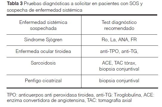 En todo paciente con sospecha de SOS se debe realizar una exploración física exhaustiva. Las pruebas auxiliares diagnósticas se basaran en los hallazgos de la exploración física. En la tabla 3 se presentan los test diagnósticos recomendados para el diagnóstico de una enfermedad sistémica asociada al SOS.