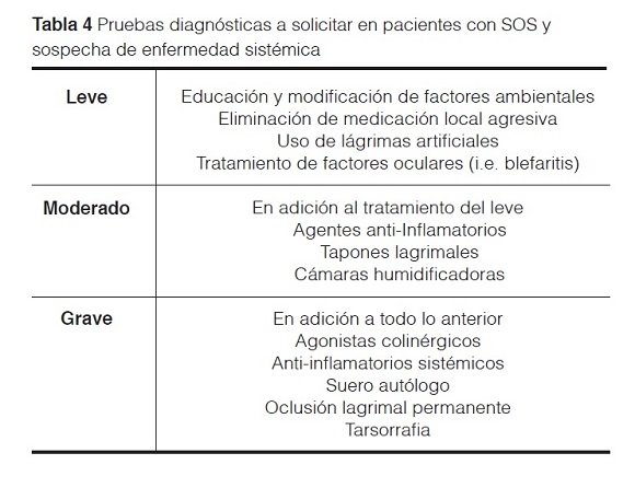 En los casos en los que el SOS está asociado a una enfermedad concomitante, esta deberá ser tratada de forma paralela al tratamiento del SOS3, 4, 8. Las medidas generales, como el uso de protectores solares y de viento con anteojos adecuados, debe ser recomendado a los pacientes con SOS(17). En todos los casos se deberá realizar una anamesis adecuada, para poder eliminar los posibles factores exógenos (medicación típica, ambiente seco etc).