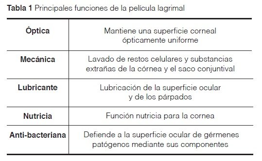 La película lagrimal es una estructura trilaminar compleja que está compuesta por una capa interna o mucosa producida por las células caliciformes, una capa intermedia o acuosa secretada por las glándulas lagrimales, y una capa más externa oleosa, producida por las glándulas de Meibomio. Esta última capa impide la evaporación de la lágrima manteniendo la humedad necesaria en la superficie ocular1,7,8. La película lagrimal cumple funciones importantes entre las que desatacan la óptica, mecánica, nutricia y antibacteriana. En la tabla 1 se presentan sus principales funciones.