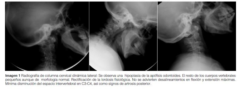 Columna cervical: Hipoplasia de la apófisis odontoides. El resto de los cuerpos vertebrales pequeños aunque de morfología normal (Imagen 1).