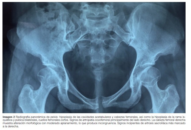 Caderas: Hipoplasia de las cavidades acetabulares y cabezas femorales, así como hipoplasia de la rama isquiática y púbica bilateralmente, los cuellos femorales cortos. La cabeza femoral derecha presenta alteración morfológica con moderado aplanamiento, lo que produce incongruencia (Imagen 2).