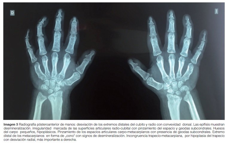 Manos: Desmineralización difusa, extremo distal de metacarpos en forma de cono, huesos del carpo hipoplásicos, pinzamiento y geodas subcondrales en espacios articulares carpo-metacarpianos (Imagen 3).