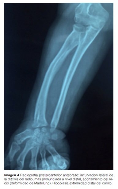 Antebrazo: Cúbito hipoplásico con curvatura del radio hacia cúbito más marcado a nivel distal (deformidad de Madelung) (Imagen 4).