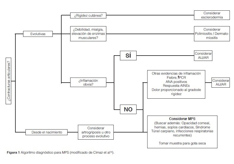 Teniendo en cuenta la baja prevalencia de la enfermedad y el subdiagnóstico de la misma se han diseñado algoritmos diagnósticos enfocados a incluir a la MPS dentro del diagnóstico diferencial de las artropatías (Figura 1)13,14.