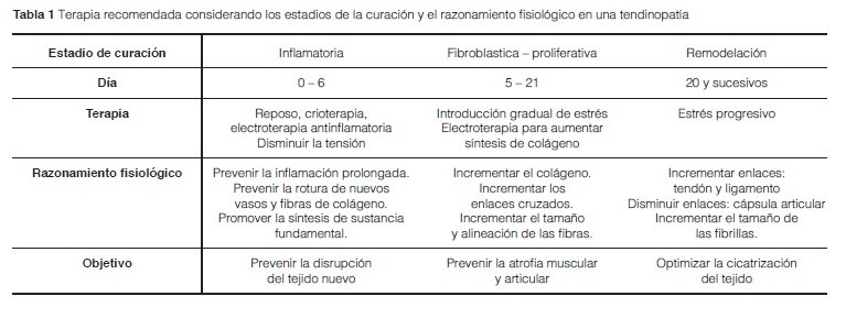 La característica determinante de la tendinopatía aguda es el componente inflamatorio. En los casos en los que se conoce el momento exacto en que se produjo la lesión, por ejemplo, un incidente tras una carga súbita, los principios fisiológicos de curación de los tejidos blandos se pueden utilizar como guía del tratamiento tal y como se observa en la tabla 1.