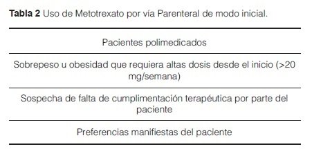 La suplementación de rutina de acido fólico o folínico no afecta en general a la eficacia del MTX, aunque datos de un estudio sugieren que el uso de estos suplementos podrían conllevar un aumento ligero de la dosis de MTX para aumentar la eficacia15.Por eso, a dosis menores de 20 mg/semana por su facilidad de manejo y el bajo coste del MTX oral se recomienda como vía preferencial de administración al inicio del tratamiento. Sin embargo, hay situaciones en las que se considerará de elección la vía parenteral desde el inicio (tabla 2): pacientes polimedicados, con sobrepeso u obesidad (pues las dosis a administrar son más altas), con bajo cumplimiento terapéutico, por preferencia del propio paciente, para reducir determinados efectos adversos gastrointestinales o para evitar errores de medicación4,16.