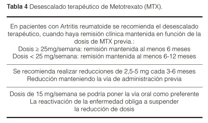 Se recomienda la reducción de dosis de MTX cuando se haya llegado a la remisión mantenida (tabla 4). En función de la dosis previa que tuviera el paciente se proponen las siguientes pautas: dosis previas ≥25 mg a la semana cuando la remisión se haya mantenido al menos durante 6 meses y con dosis previas < 25 mg semana cuando la remisión se haya mantenido al menos 6-12 meses. Se recomiendo descensos de 2,5 a 5 mg cada 3-6 meses controlando la actividad de la enfermedad y al ser posible manteniendo la vía de administración previa. Se aconseja que al llegar a una dosis de 15 mg a la semana, se puede ofrecer el cambio a vía oral, en caso de estar en administración subcutánea, con la excepción que hubiera intolerancia a la vía oral previa o bien se sospecha de mayor eficacia con la vía de administración previa. En caso que se produzca reactivación de la actividad de la enfermedad se debería interrumpir el proceso de desescalado terapéutico4.