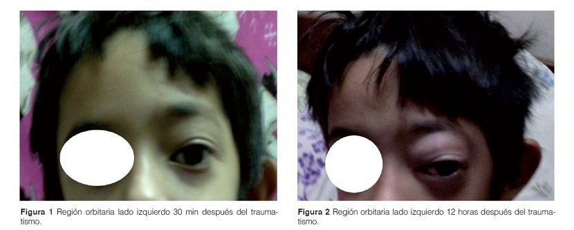 Escolar de 7 años de edad, de sexo masculino, procedente de Asunción, que consultó por historia de traumatismo de tipo contuso en la región ocular izquierda (golpe contra la cabeza de otro niño) de 12 horas de evolución, con posterior proptosis del ojo izquierdo, con aumento progresivo, al que horas después se añaden signos inflamatorios a nivel de los párpados. Niega fiebre, cefalea, alteración de la visión u otros síntomas acompañantes (Figuras 1 y 2).