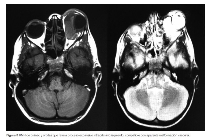 Al segundo día de internación, presentó un aumento de la intensidad del dolor local y de la proptosis que no cedió con analgésicos, por lo que se le realizó un drenaje quirúrgico de urgencia por endoscopía nasal rígida. Se evacuó gran cantidad de líquido hemático. Posterior al procedimiento se realizó una resonancia magnética nuclear (RMN) de cráneo y órbitas, que informó la presencia de un proceso expansivo intraorbitario izquierdo, evocando en primer lugar una malformación vascular, probable hemolinfangioma (Figura 3).