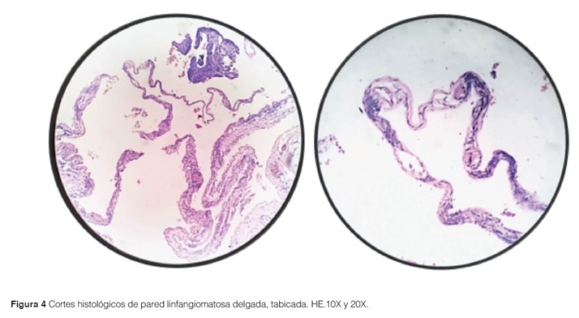 Al sexto día de internación, se procede a la realización de una orbitotomía exploradora de órbita izquierda a través de la herida abierta superior izquierda. En dicha ocasión se constataron múltiples cavidades quísticas revestidas de tejido liso, que drenaba sangre oscura abundante. Se procedió a la cauterización y toma de nueva muestra para anatomía patológica; el niño presentó mejoría clínica. El informe de Anatomía Patológica menciona que los hallazgos histológicos son compatibles con Linfangioma quístico (Figura 4).