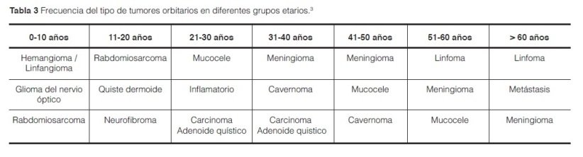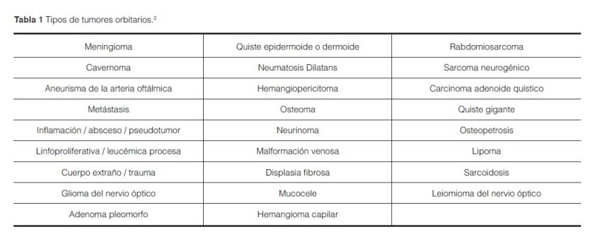 Las lesiones tumorales de la órbita en los niños representan un espectro histológico diferente al de los adultos, pudiéndose presentar destrucción o deformidad ósea y pérdida de la visión1-2. Los síntomas más frecuentes con los que pueden presentarse los tumores orbitarios son la proptosis y la disminución de la agudeza visual. (Tabla 2)3.