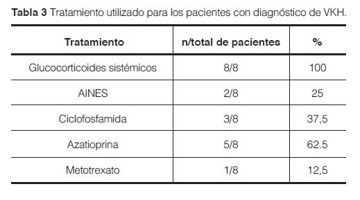 Methods: Retrospective study based on the review of medical records of patients with a diagnosis of VKH who are being followed by the Department of Rheumatology of Hospital de Clínicas of FCM – UNA from 2000 until 2015.