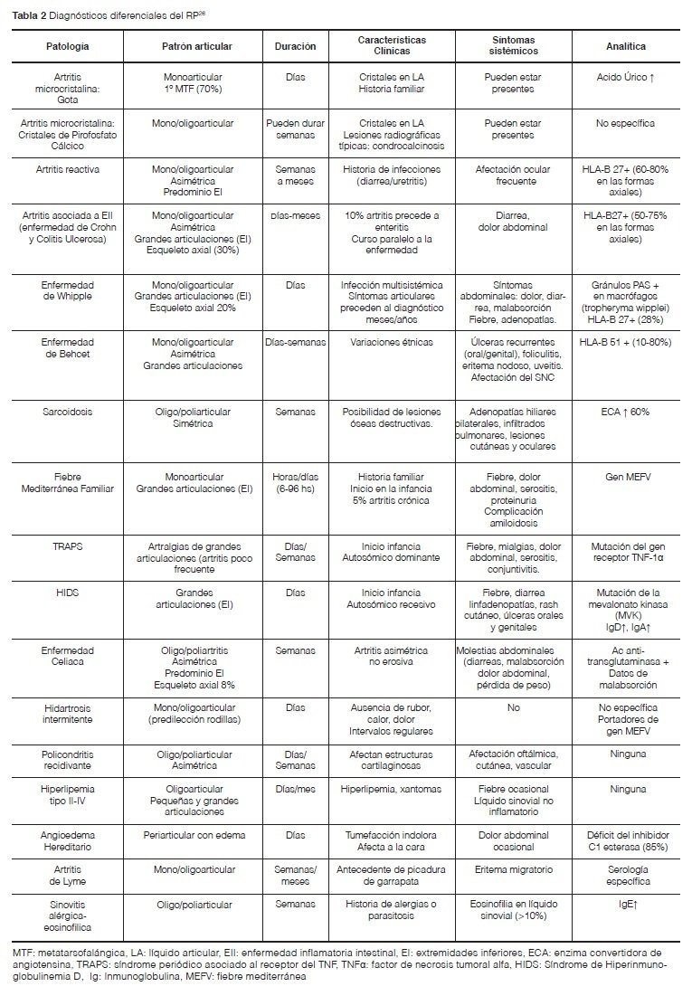 En la tabla 2 se presentan los diferentes cuadros que pueden cursar con artritis intermitentes y obligan a un diagnóstico diferencial con el RP. Y en la tabla 3 se exponen algunos datos presentes en pacientes con sospecha de RP que según nuestro criterio deben alertar al clínico sobre la posibilidad de otros diagnósticos26.