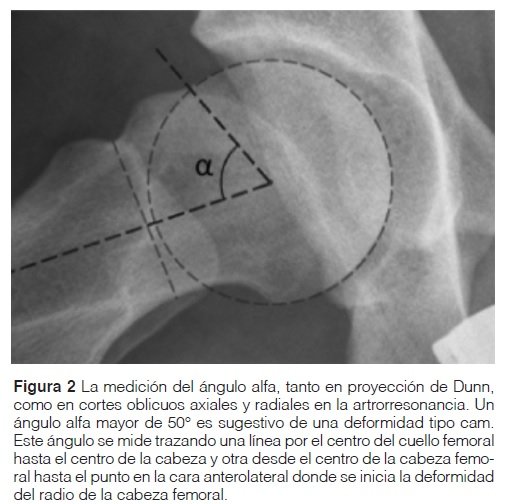El ángulo alfa(15-17) se obtiene trazando una circunferencia que sigue el perímetro del eje de rotación de la cabeza femoral. En el punto donde dicha circunferencia contacta con el borde anterior del cuello femoral, se traza una línea dirigida al centro de la cabeza femoral. Esta línea y el eje cervical forman el ángulo alfa que en caderas normales es inferior a 50°. La importancia de este ángulo radica en que en presencia de mecanismos tipo CAM este ángulo esta aumentado (Figura 2).