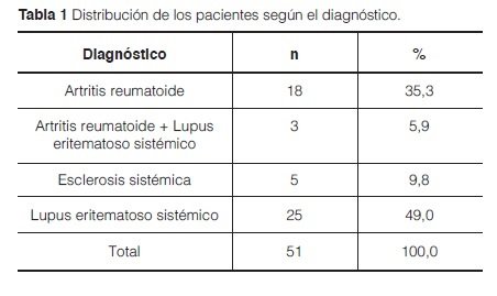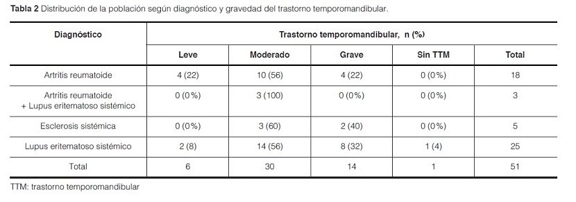 Resultados: Se realizó la encuesta a 51 pacientes consecutivos en los que el rango de edad fue de 30 a 56 años, con una mediana de 45 años. El 49% correspondía a pacientes con lupus eritematoso sistémico (LES), el 35,3% a artritis reumatoide (AR), el 9,8% a esclerosis sistémica (ES) y el 5,9% a pacientes con superposición de lupus y artritis reumatoide. El 98% de la población analizada presento algún signo o síntoma de TTM, siendo esta afectación moderada en el 59% de los pacientes. Todos los pacientes con AR y ES, y el 98% de los pacientes con LES presentaron algún signo o síntoma de TTM.