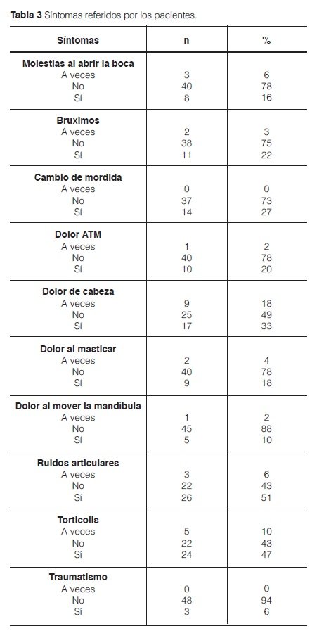 En relación a la sintomatología, el 44% (24/51) refirió torticolis y el 51% (26/51) ruidos articulares. En la tabla 3 se presentan la frecuencia y el porcentaje de los diferentes síntomas referidos por los pacientes.