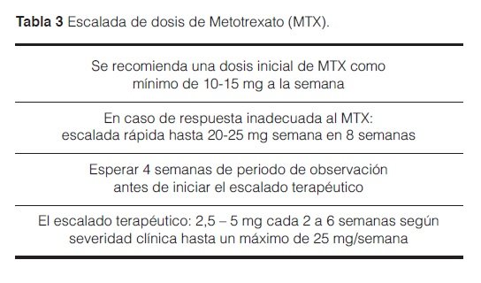 Una vez establecida la dosis inicial de MTX, si no se consigue al respuesta adecuada se debe realizar un escalado rápido de la dosis hasta alcanzar 20-25 mg a la semana (tabla 3). Antes de iniciar el aumento de dosis se debe establecer un periodo de observación de 4 semanas para determinar si esta dosis es o no eficaz. En caso de insuficiente respuesta, se recomiendan incrementos de 2,5- 5 mg cada 2 a 6 semanas, según la gravedad de la enfermedad hasta alcanzar la dosis de 25 mg a la semana4,6,19,20.