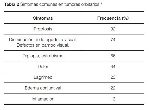 Las lesiones tumorales de la órbita en los niños representan un espectro histológico diferente al de los adultos, pudiéndose presentar destrucción o deformidad ósea y pérdida de la visión1-2. Los síntomas más frecuentes con los que pueden presentarse los tumores orbitarios son la proptosis y la disminución de la agudeza visual. (Tabla 2)3.
