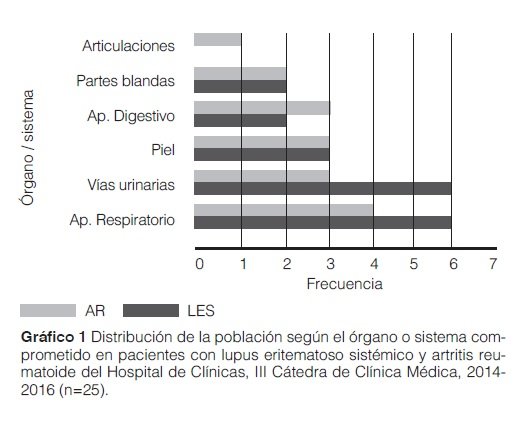 Los principales órganos y sistemas afectados en los pacientes fueron: aparato respiratorio, vías urinarias y piel en orden decreciente de frecuencias, similar a un estudio publicado sobre la población chilena con estas enfermedades donde observaron estas mismas localizaciones y además constataron que los más frecuentemente afectados fueron los pacientes con LES9.