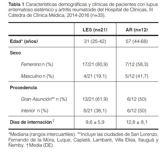 Durante el periodo de estudio se identificaron a 33 pacientes que cumplían con los criterios de inclusión, 21/33 con LES (63,4 %) y 12/33 (36,4 %) con AR. La edad promedio fue de 43,8±18,5 años, con predominio en el sexo femenino (73 %), y en su mayoría procedentes de Gran Asunción. Las características demográficas y clínicas de los pacientes, así como la duración de la internación se presentan en la tabla 1.