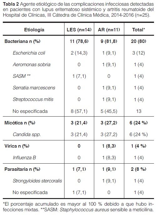 En relación al agente etiológico, las complicaciones infecciosas predominantes fueron las bacterianas y la micótica (ver Tabla 2). Presentaron infecciones mixtas 3/14 pacientes con LES y 3/11 con AR.