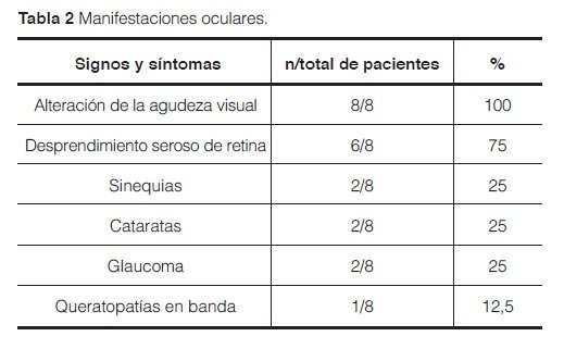 Fueron incluidos de los 3.727 registros clínicos desde el 2011 al 2015, a 8 pacientes con el diagnóstico de VKH, que acudieron al Departamento de Reumatología del Hospital de Clínicas. Todos los pacientes fueron remitidos de Oftalmología por alteración de la agudeza visual, 5/8 (62,5%) mujeres y 3/8 (37,5%) varones, con una edad promedio de 44,6 ± 8,8 años. En la tabla 2 se resume la afectación ocular. Ninguno de los pacientes presentó hipotensión ocular y ninguno con complicaciones oculares precisó de vitrectomía.