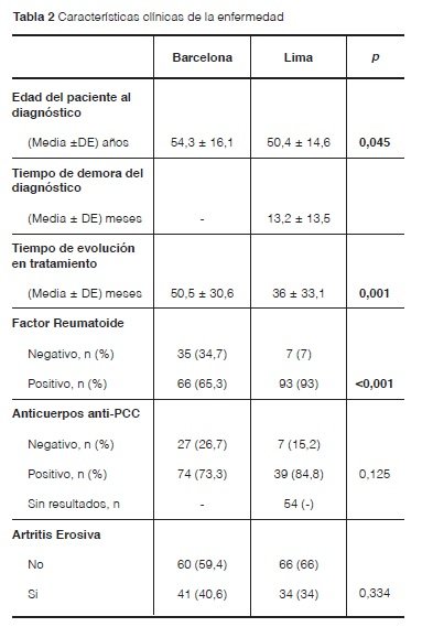 La edad media del diagnóstico de la enfermedad en Barcelona fue de 54,3 ± 16,1 años y en Lima fue de 50,4 ± 14,6 años (p = 0,045). El tiempo de demora del diagnóstico sólo fue medido en Lima, encontrándose una demora de 13,2 ± 13,5 meses. El tiempo promedio de evolución de la enfermedad en tratamiento en Barcelona fue de 50,5 ± 30,6 meses y en Lima 36,8 ± 33,1 meses (p = 0,001). Todos los pacientes tenían resultados de FR, siendo positivo en Barcelona en 66 (65,3%) pacientes y en Lima en 93 (93%) (p < 0,001). En Barcelona todos los pacientes tuvieron resultados de anticuerpos anti-PCC, donde 74 (73,3%) pacientes tenían resultados positivos; en Lima la prueba sólo se realizó en 46 pacientes, de ellos 39 (84,8%) pacientes tenían un resultado positivo. Se encontró artritis erosiva en 41 (40,6%) pacientes en Barcelona y en 34 (34%) en Lima (p = 0,334) (tabla2).