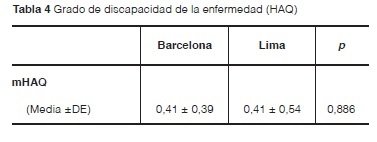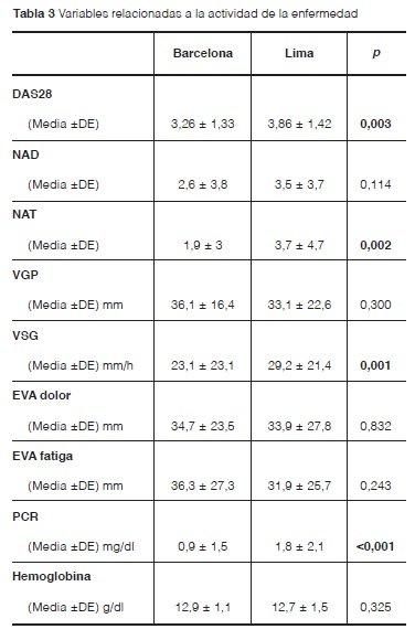 La media del DAS28 en Lima fue mayor que en Barcelona (3,86 ± 1,42 vs 3,26 ± 1,33, p = 0,003). En los pacientes originarios de Lima, también se encontraron resultados elevados de la VSG (29,2 ± 21,4 mm/h vs 23,1 ± 23,1, p = 0,001) y de la PCR (1,8 ± 2,1 vs 0,9 ± 1,5 mg/dl, p < 0,001) al ser comparados con los pacientes originarios de Barcelona (tabla 3).