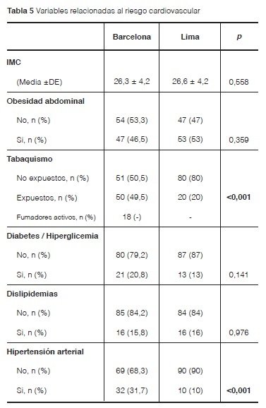 La media del IMC en Barcelona fue de 26,3 ± 4,2 y en Lima fue 26,6 ± 4,2 (p = 0,558). Se encontró obesidad abdominal en 47 (46,5%) pacientes en Barcelona y en 53 (53%) pacientes en Lima (p = 0,359). Sólo en Barcelona se encontraron 18 pacientes fumadores activos, en Lima ninguno. En Barcelona se encontró exposición al tabaco (fumadores activos y ex fumadores) en 50 (49,5%) pacientes, y en Lima en 20 (20%) pacientes expuestos, que correspondieron sólo a ex fumadores (p < 0,001).