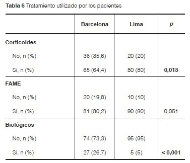 Los pacientes de Lima utilizaron de tratamiento concomitante, dosis bajas de glucocorticoides con mayor frecuencia que los pacientes de Barcelona 80% vs 64,4% (p = 0,013). Los FAMEs se utilizaron en 81 (80,2%) pacientes en Barcelona y en 90 (90%) pacientes en Lima (p= 0,051). Sólo 5 pacientes en Lima usaron biológicos (tabla 6).